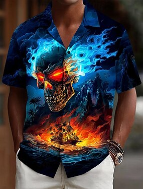 Homens Caveiras Labareda Veleiro Camisa Social Camisa cubana camisa de botão Manga Curta Punk gótico escuro Feriado Streetwear Verão Camisa com gola de acampamento Impressão 3D Azul 1# Azul Escuro