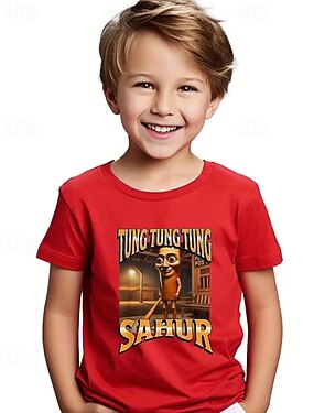 Camiseta azul para meninos com estampa de personagem de desenho animado - design tung tung tung sahur manga curta verão primavera moda básica crianças 4-12 anos gola redonda casual ao ar livre ajuste