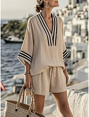 Mulheres Conjuntos de shorts Linho de algodão sintético Manga 3/4 Decote V Listrado Férias Diário Casual Diário Ao ar livre Preto Branco Rosa Verão Ajuste Largo