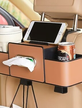 Organizador 3 em 1 para banco traseiro de carro, em couro sintético, com porta-lenços e dois porta-copos. Organizador multifuncional para viagens em família e uso diário.