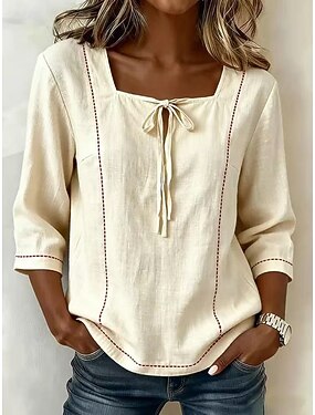 Mulheres Camisa Social Blusa Linho de algodão sintético Frufru Bordado Botões Côr Sólida à moda Casual Manga 3/4 Decote V Tops regulares Diário Azul Branco Verão Primavera Outono
