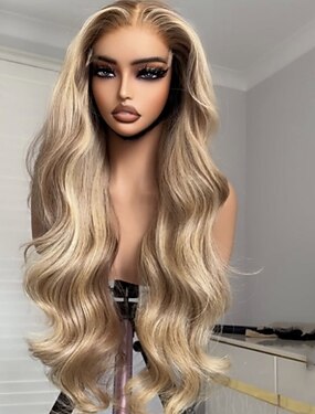 Peruca brasileira de cabelo humano loiro acinzentado com mechas, fecho de renda 5x5, peruca frontal de renda 13x4, peruca ondulada com repartição livre e baby hair, linha capilar natural.