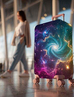 Capa protetora elástica para mala de viagem com estampa artística.
