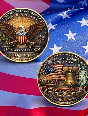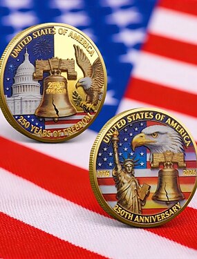 Moeda comemorativa do 250º aniversário dos EUA, representando o Dia da Independência e o Sino da Liberdade com o emblema da águia. Item colecionável comemorativo.