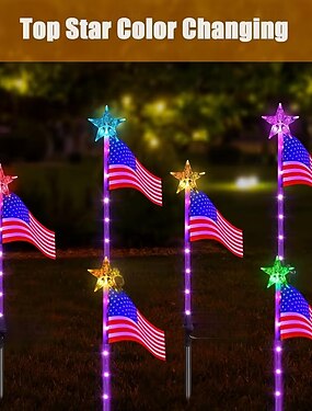 Luminárias solares de jardim com a bandeira dos EUA, LED com 7 cores de mudança de cor, luminárias de paisagem com a bandeira americana, decoração externa para o 4 de julho, luminárias solares de