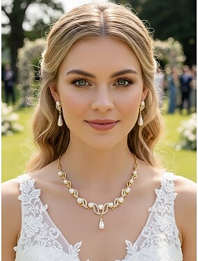 Conjunto de colar e brincos femininos em liga metálica com imitação de pérolas, nas cores dourada e prateada, design elegante com detalhes em cristal, perfeito para casamentos e jantares formais.