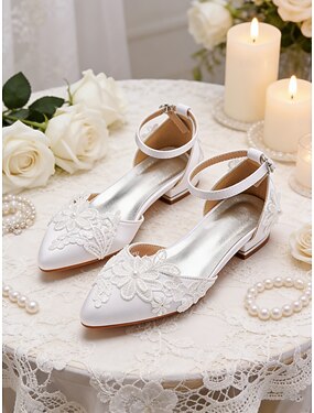 Sapatilhas femininas brancas de renda com tira no tornozelo, elegantes sapatos estilo noiva para casamentos na igreja.