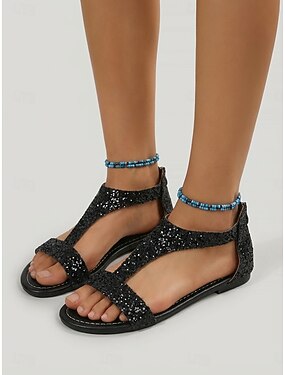 Sandálias rasteiras pretas com tira em T e glitter para mulheres - um toque chique e brilhante perfeito para férias na praia, passeios à beira-mar e viagens para ilhas tropicais.