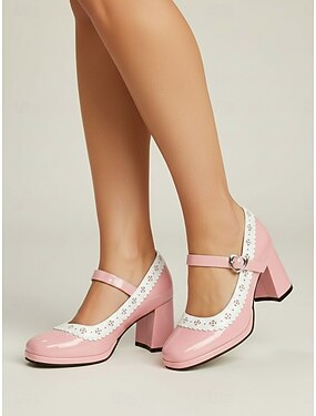 Sapato Mary Jane feminino retrô preto em imitação de verniz - elegante salto bloco alto com acabamento em renda branca recortada &Fivela em formato de coração para looks modernos com toque vintage e