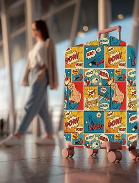 Capa protetora elástica para mala de viagem com estampa artística.