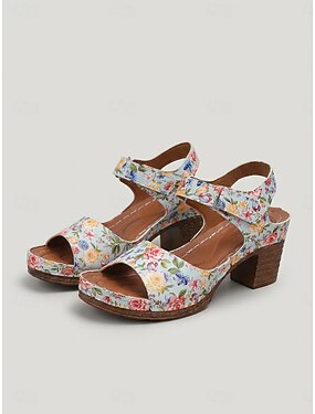 Sandálias femininas coloridas com estampa floral e salto bloco – sandálias casuais confortáveis de bico aberto com tira no tornozelo, ideais para jardim e férias. &uso diário