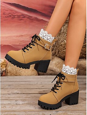 botas plataforma grossas com cadarço, fivela e punho de renda, disponíveis em várias cores