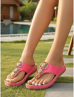 Sandálias femininas brancas de dedo com aplicações de miçangas e sola acolchoada – chinelos boho confortáveis para resorts ao ar livre, relaxar à beira da piscina e curtir as férias de verão.