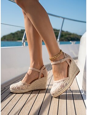 Sandálias espadrille femininas elegantes na cor damasco com salto plataforma - modelos respiráveis em renda floral e tela com tira ajustável no tornozelo, ideais para cruzeiros e viagens de iate de