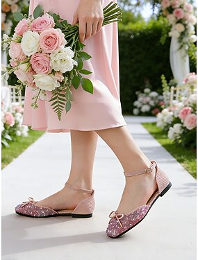 Sapatilhas de ballet femininas rosa com strass - sapatos de salto baixo com laço brilhante no tornozelo, ideais para damas de honra e para uso externo no jardim. &cerimônia de casamento no gramado