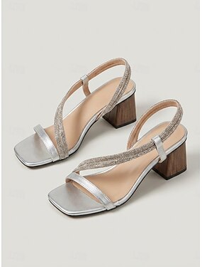 Sandálias femininas prateadas com salto bloco – sandálias de tiras com bico aberto e salto grosso para convidadas de casamento no jardim &eventos de verão
