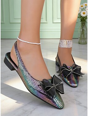 Sapatilhas femininas iridescentes com laço preto – detalhes elegantes em strass brilhantes para festas, eventos e ocasiões formais.