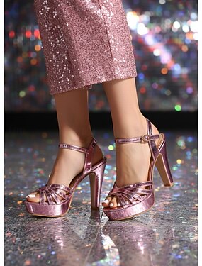 Sapatos de salto alto rosa com glitter e laço de strass para mulheres – sapatos românticos para festas de Dia dos Namorados, scarpins brilhantes com tira no tornozelo para encontros românticos e