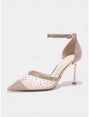 Sapatos de salto alto femininos com bico fino, strass iridescente e tela - scarpins estilete com tira no tornozelo na cor champanhe, ideais para coquetéis e bailes de formatura. & casamento