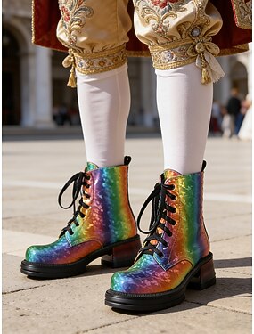 Botas Curtas Lace-Up Femininas para Mardi Gras em Cores do Arco-Íris - Calçado Vibrante para Festa de Carnaval Estilo de Festival Colorido Botas Confortáveis de Salto Bloco para Fantasias e