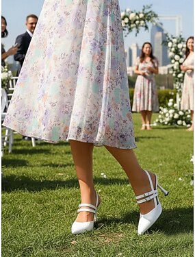 Sapatos de salto alto brancos femininos com tira no calcanhar e fivela – elegantes sapatos de bico fino e salto agulha para convidadas de casamento, ocasiões formais e eventos especiais.