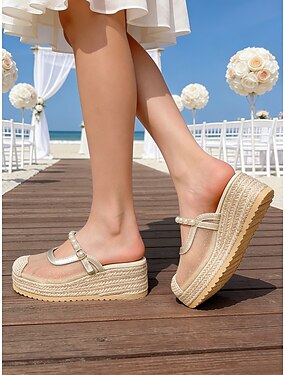 Sandálias espadrille femininas com plataforma em tela e tira de pérolas - calçados confortáveis de salto anabela, ideais para convidadas de casamento em cerimônias na praia.