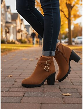 botins femininos de camurça com tiras de fivela dupla e salto bloco, calçado casual para looks do dia a dia
