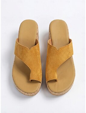 Sandálias plataforma femininas em camurça amarelo mostarda com sola texturizada de cortiça, ideais para férias ao ar livre e viagens de verão. &roupa de resort de praia