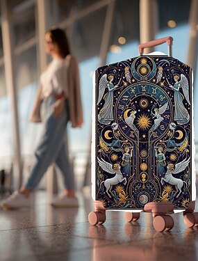 Capa protetora elástica para mala de viagem com estampa artística.