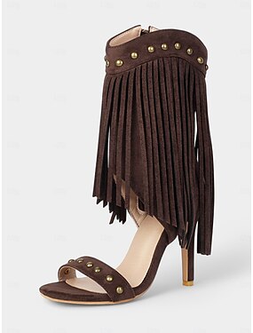 sandálias femininas com franjas western – sandálias de salto aberto em camurça boêmia marrom com detalhes de tachas para estilo cowgirl, festivais de música e passeios de verão