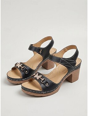 Sandálias femininas pretas com salto bloco e strass, com tira ajustável no tornozelo, calçado casual da moda para férias e compras. &passeios no jardim