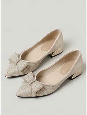 Sapatos de salto baixo bloco com glitter champanhe para mulheres, detalhe de laço e bico fino, ideais para a mãe da noiva em casamentos ao ar livre. &eventos formais