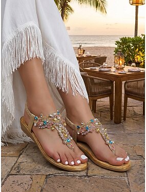 sandálias femininas rasteiras com strass dourado – sandálias elegantes boêmias com tiras em T para o verão, férias na praia e passeios casuais
