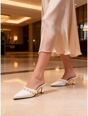 Sapatos de noiva femininos com laço de cetim e detalhes em pérola – sapatos de salto agulha de bico fino para casamentos formais na igreja e em salões de baile.