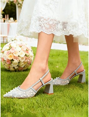 Sapatos de salto slingback femininos com pérolas - elegantes sapatos de casamento de bico fino com renda para damas de honra. &convidados, saltos bloco para o jardim &cerimônias ao ar livre