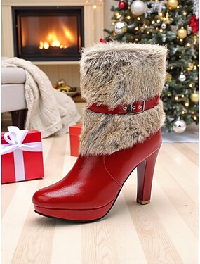 Botas femininas de couro sintético branco com punho de pele sintética e fivela, salto alto elegante, perfeitas para o inverno, festas de Natal e comemorações de feriados