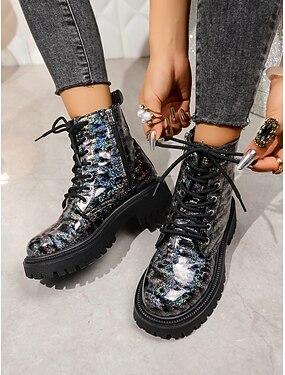 Mulheres Botas Coturnos Streetwear Festival de Música Ziper Salto de bloco Ponta Redonda Punk Couro Sintético zíper Preto