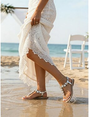 sandálias femininas com tiras em T e cristais – sandálias rasteiras elegantes com strass para casamentos, praia ou ocasiões especiais