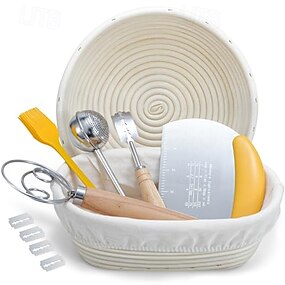 O kit para fermento natural inclui uma forma redonda de 23 cm (9 polegadas). &Cesto oval de fermentação de pão de 25 cm (10 polegadas) com lâmina para pão, raspador de massa, batedor de massa, pincel