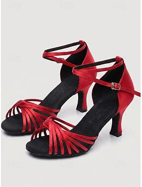 Sapatos de dança latina femininos em cetim vermelho – sapatos de salsa e de salão com bico aberto e tira cruzada, ideais para prática profissional. & desempenho