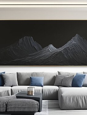 Pintura artesanal de montanha com textura 3D preta, arte abstrata de paisagem, pintura de montanha preta texturizada em estilo gesso sobre tela.