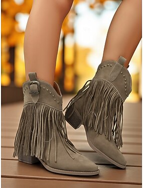 Botas femininas de camurça com franjas, acabamento cravejado e fivela estilo cowboy, calçado estilo boêmio