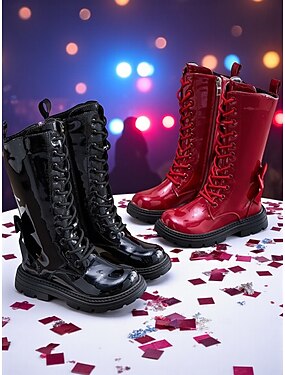 Sapatos de fantasia de estrela pop inspirados em ídolos coreanos, botas de couro envernizado com cadarço para meninas - botas de combate estilosas de cano médio com detalhe de laço para uso escolar e de festa