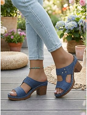 Sandálias mule femininas azuis com recortes, salto bloco grosso, confortáveis para caminhadas casuais de verão e viagens. &roupa para uso diário