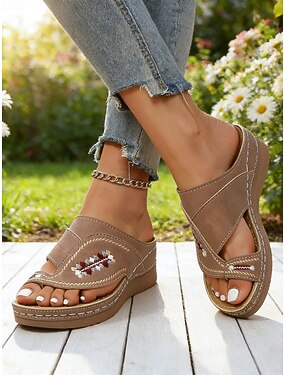 Sandálias femininas bege com salto anabela e bordado floral - design elegante de bico aberto com tira ajustável, perfeitas para passeios casuais, festas de verão e uso diário.