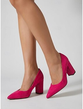 Sapatos de salto bloco elegantes em camurça rosa para mulheres - bico fino, ideais para o dia a dia e looks casuais. &look de rua estiloso