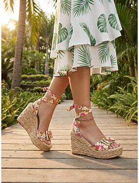 Sandálias femininas românticas rosa com estampa floral e salto anabela - confortáveis espadrilles com tiras de amarrar no tornozelo. &Detalhe de laço para resorts ao ar livre, férias de verão &festas