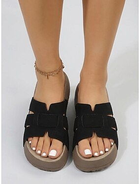 Sandálias plataforma femininas confortáveis em camurça preta - tiras largas recortadas, ideais para férias na praia e resorts ao ar livre. &viagens de verão