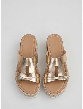 Sandálias plataforma espadrille douradas femininas – sandálias metalizadas para usar na praia e nas férias de verão.