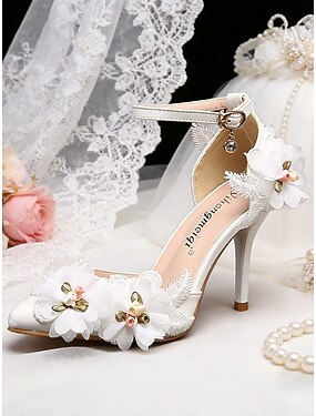 Sapatos de noiva brancos estilo d'Orsay com salto agulha – scarpins de bico fino com detalhes florais em 3D para casamentos no jardim e na igreja.